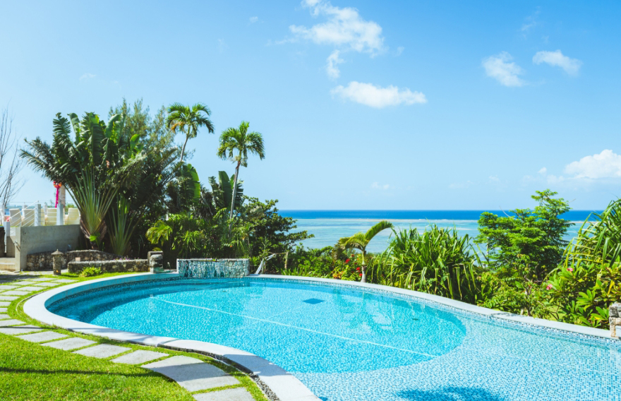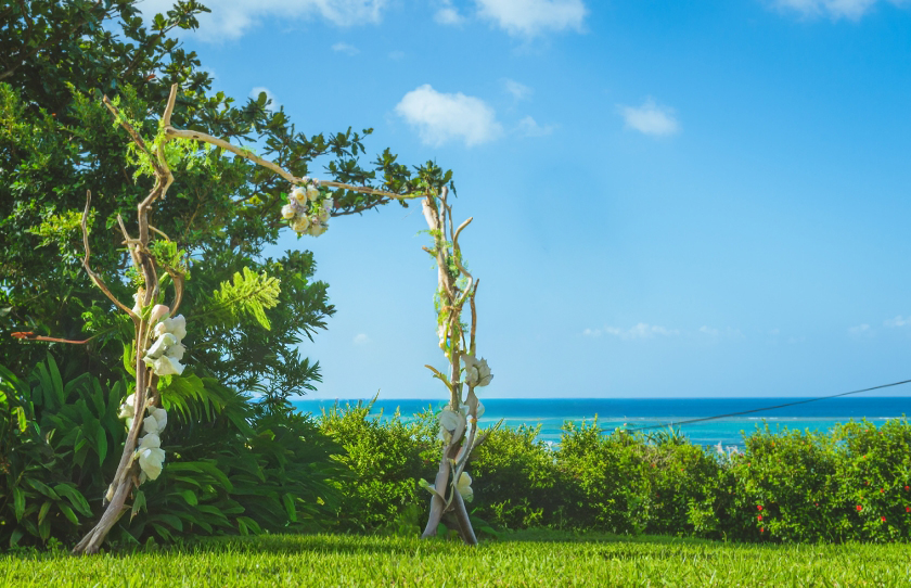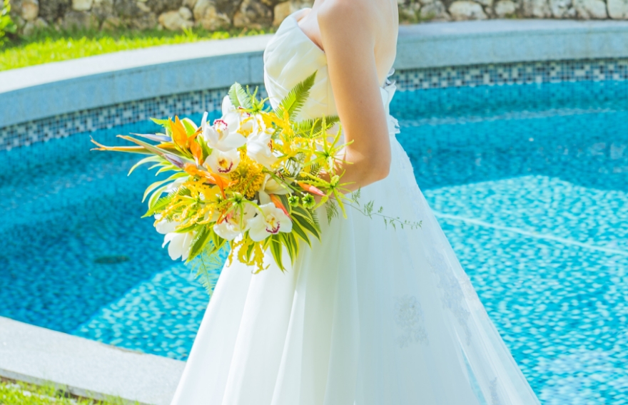 緑豊かなプライベートガーデンやプールが花嫁の美しい姿を引き立たせます