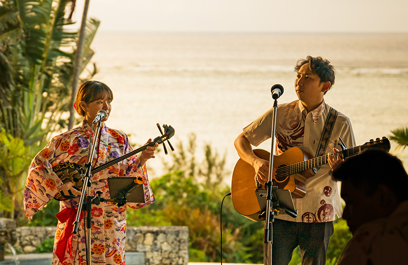 - ゲストの皆さまにさらに沖縄を感じて頂けますよう、島唄ライブで沖縄の音楽をお楽しみください。透きとおる声、三線の優しい音色、島唄を聴きながらのお食事は格別です。